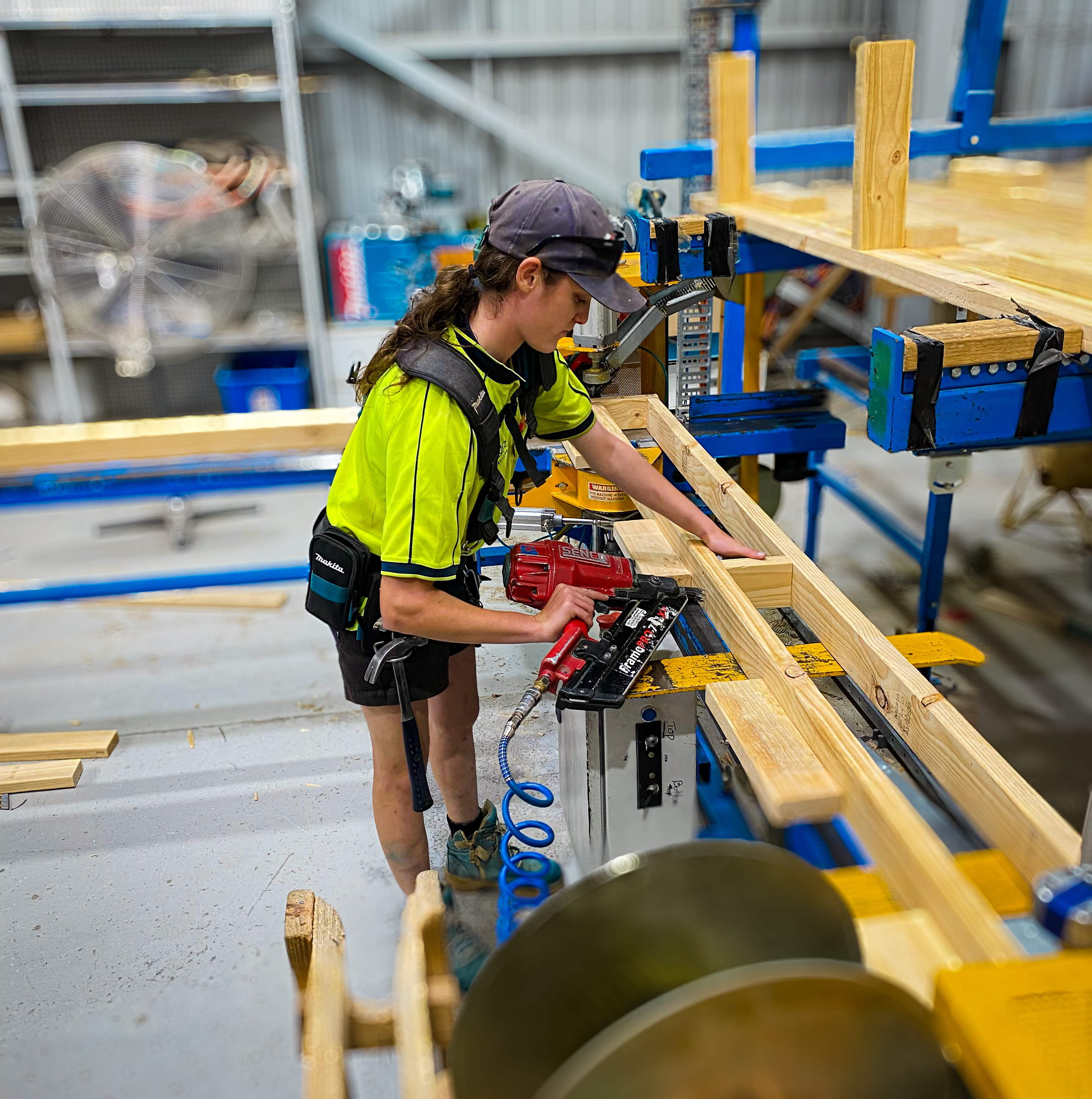 I am a first fix framer at a prefabricated building construction company. In the factory, we build wall frames, floors and roofs. We do cladding, Hebel, beams, posts and detailed notches. We install windows and doors, make cassettes and raked walls. A lot of our work is done on the auto nailer, which gives us great experience using different tools and machinery. We have also started doing more traditional joinery which has been really interesting to learn. We also head out to site to install everything we have built — from standing wall frames to installing purlins. We do it all. I love that there is always something new to learn and there is so much variety between different house designs.