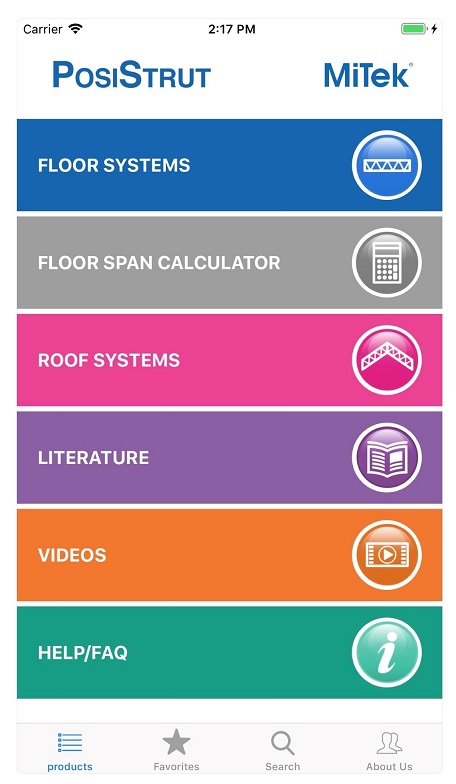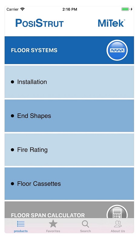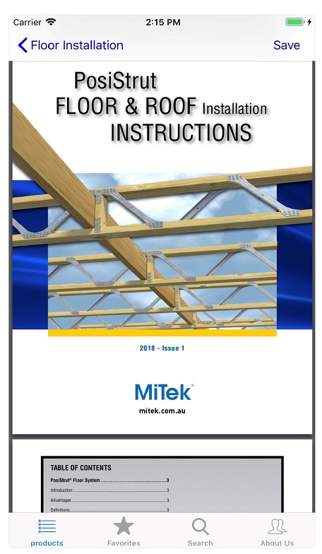 The MiTek Posi-Strut App gives ready access to valuable information about Posi-Strut ROOF and FLOOR Systems…including a special section on MiTek’s very popular Posi-Strut Flooring Cassettes. It is very easy to navigate, with a user friendly search function plus the ability to go straight to a ‘favourites’ section.